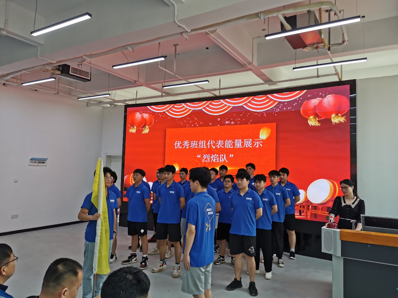 接下来进行了优秀班组能量展示环节,“烈焰队”的20位同学在队长的带领下喊出队名和口号,并现场演唱了队歌。他们列队整齐、声音洪亮、歌声有力,将活动推向高潮,良好展现了咸职员工的精神面貌。