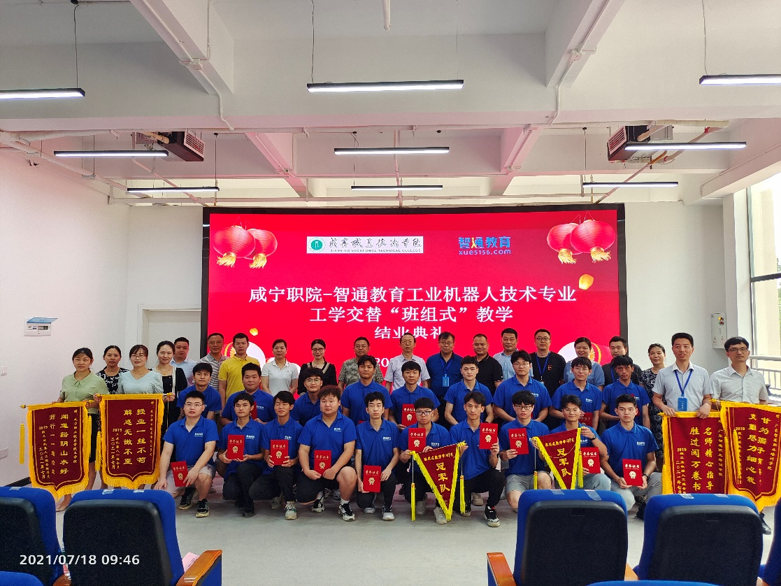 为总结教学效果,表彰先进典型,塑造良好班风学风。7月18日8点58分,校企双方在虚拟仿真大楼会议室隆重举行了“咸宁职院-智通教育工业机器人技术专业工学交替班组式教学”结业典礼。党委委员、总会计师胡绍山,教务处处长吴涛,DB真人旗舰经理胡新和,工公司党总支书记柳明珠,东莞市智汇自动化科技有限公司常务副总经理李向阳,广东智通职业培训公司总监王刚涛,DB真人旗舰其他班子成员,智能装备系全体教师,“班组式”教学企业方老师,19级工业机器人全体员工参加了本次结业典礼,典礼由柳明珠同志主持。