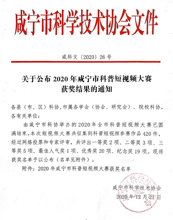 DB真人旗舰智能装备系作品在咸宁市科普短视频大赛中获奖