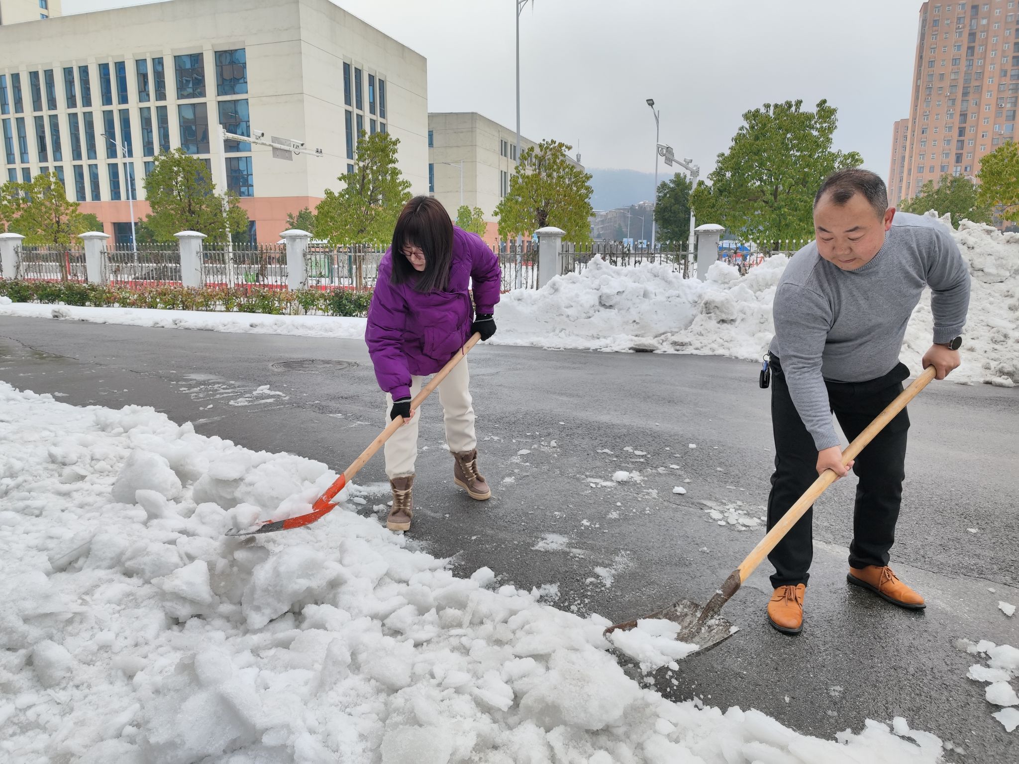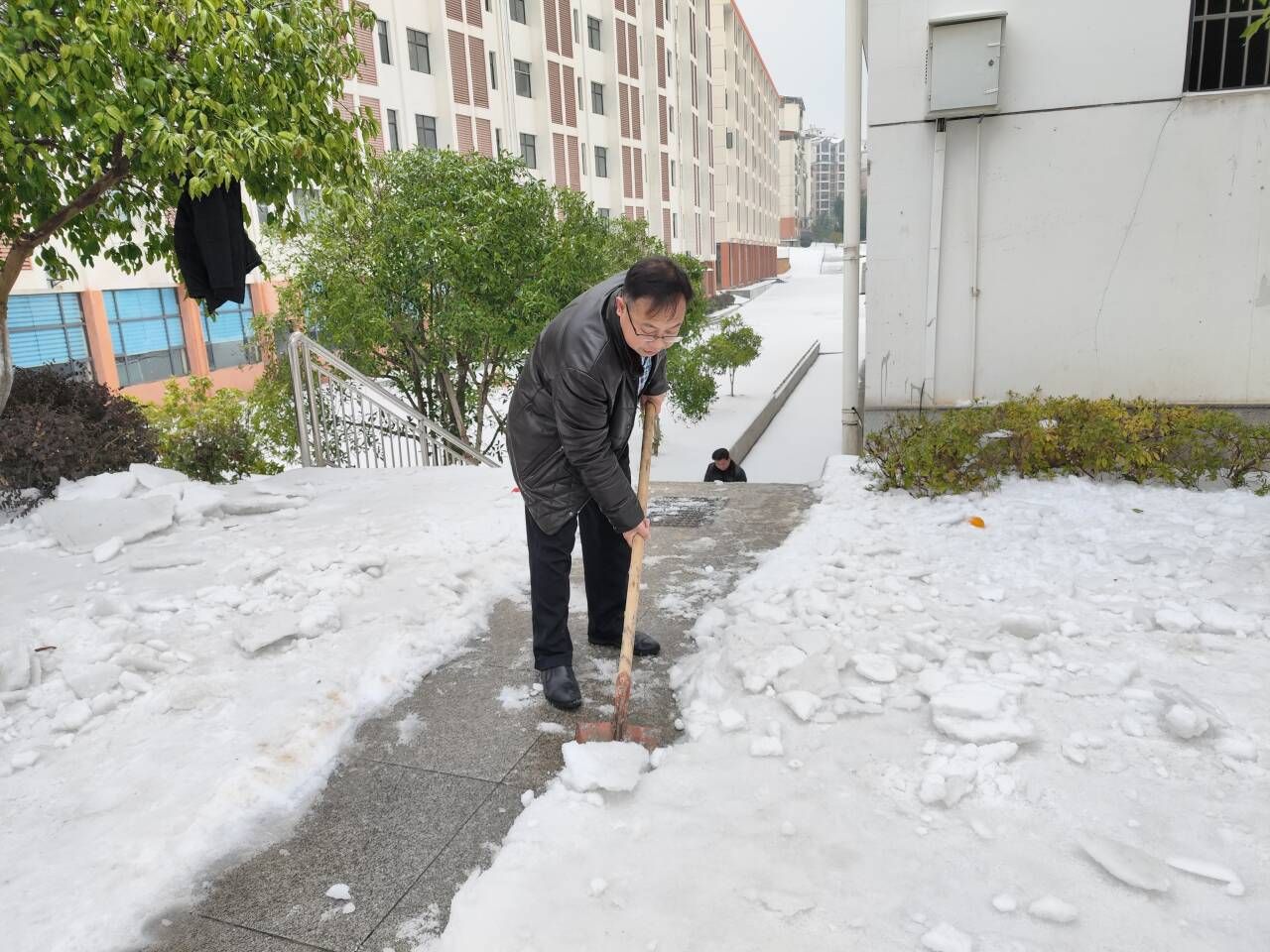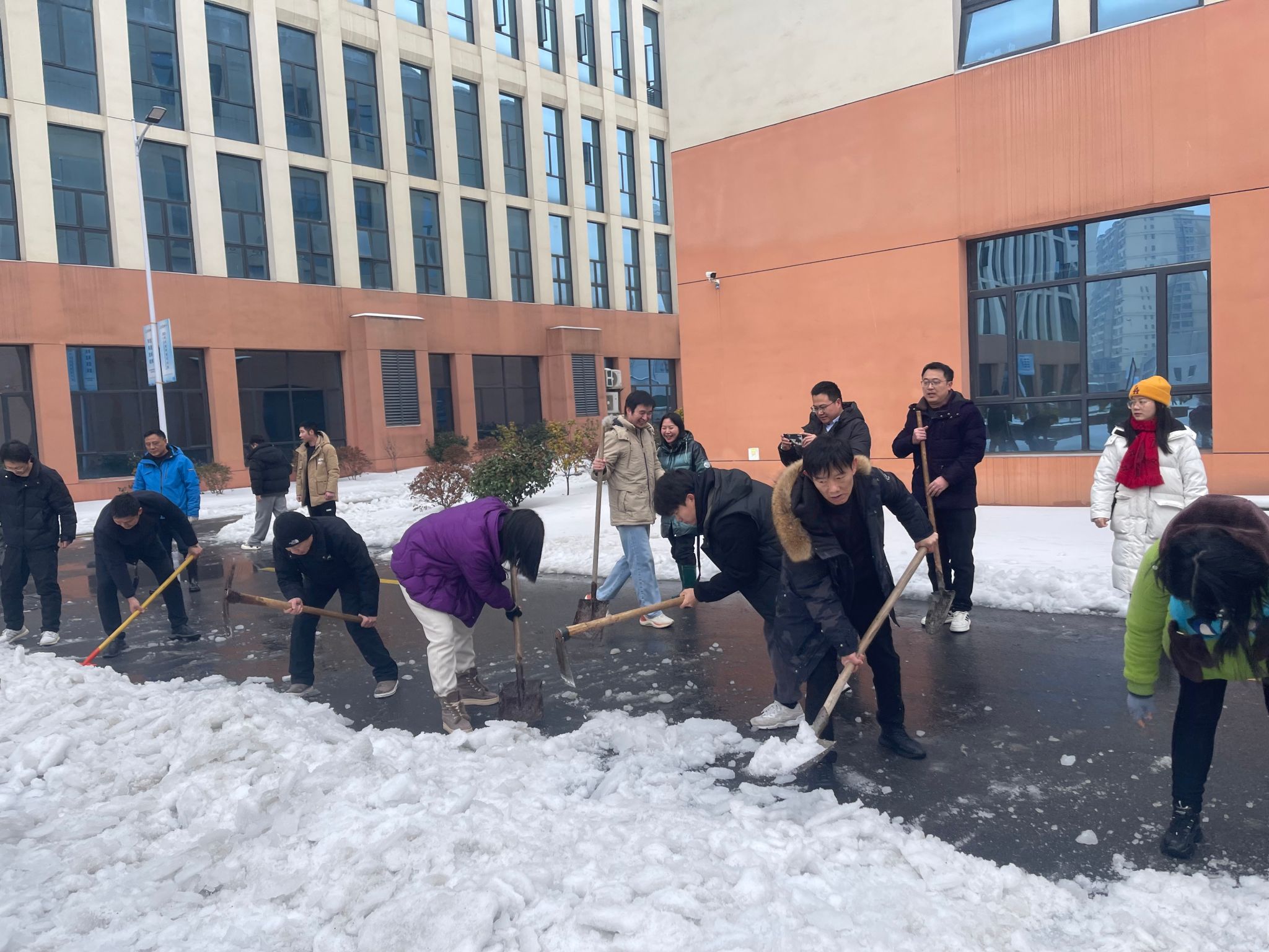 24日下午,在接到公司关于号召全校教职员工参与清雪活动通知后,院领导第一时间做出安排部署,及时与校办及兄弟院系沟通,确定包保区域及人员分工,并迅速协调和动员院部职工自备工具,确保清雪除冰活动能够有序开展。