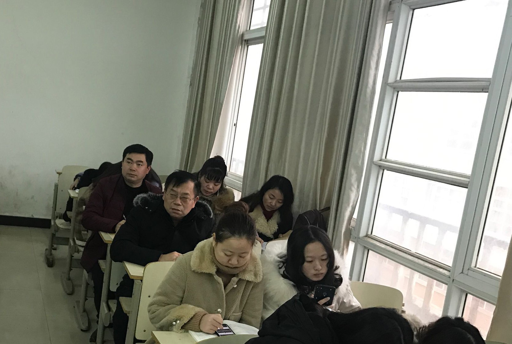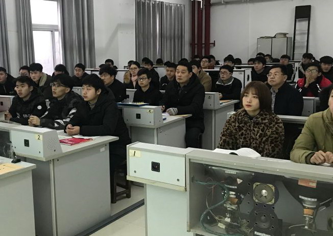 图1 资产处处长葛光明和DB真人旗舰胡新和、马芬、石国凤在文A604听课