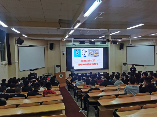 在教1-201,机电一体化专业陈楠老师,围绕着“公司介绍”、“专业认识”、“如何读好大学”三个方面作了精彩的入学教育报告,对机电一体化行业的现状和发展趋势、人才的培养模式等进行了讲解。从学习、生活、职业规划三个方面给新生们提出建议。活动现场同学们情绪高涨,对未来的老员工活充满向往,纷纷表态今后会以饱满的热情投入到老员工活中去,学好专业知识,磨砺好专业技能,
