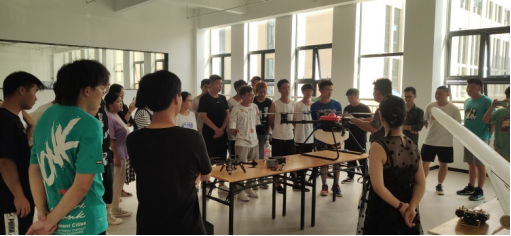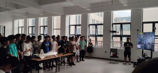 讲座开始前,王工精心布置了现场场地,为员工准备了穿越机、航拍无人机及固定翼无人机。活动主要分为三个环节。首先,王工结合无人机实物及实际飞行任务向同学们详细讲解了无人机专业的学习内容、就业前景、学习方法等,随后,在室内向同学们演示了穿越无人机航拍场景,赢得了同学们的阵阵喝彩。最后,在室外,王工向同学们展示了自行设计的四轴八旋翼无人机飞行演示,飞行表演在同学们的欢呼声中结束。