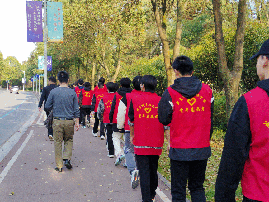 活动中,志愿者们身着统一马甲列队健步前行,在应孔建老师的带领下边欣赏春日美景,边聆听生态保护专题微党课。沿途设置“环保知识问答”、“古树名木认知” " 等互动环节,同学们分组分片细致清理步道两侧的烟蒂、塑料袋等垃圾,用实际行动扮靓绿色家园。