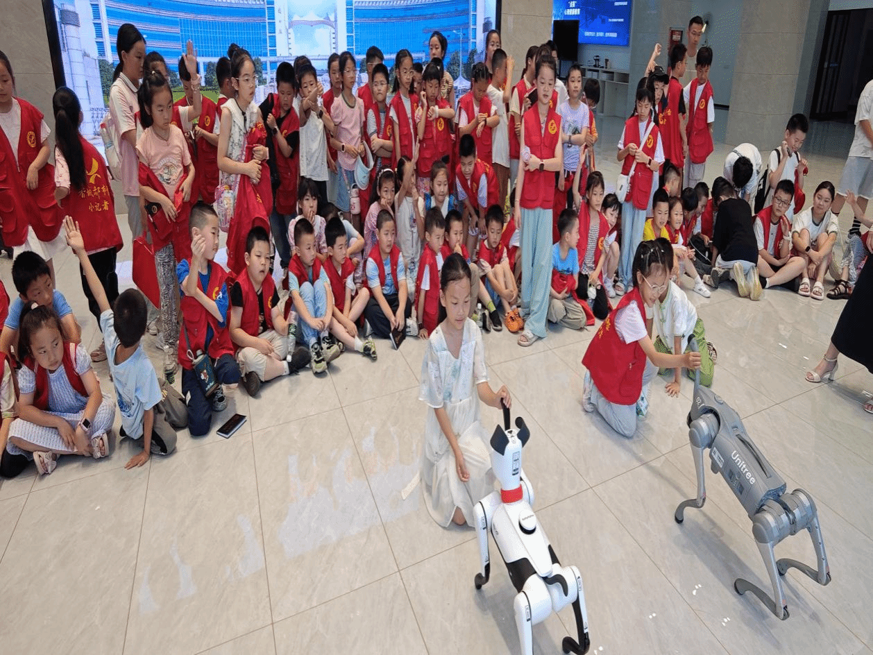 活动第一站,科普基地的智能机器人展区迎来了一群好奇的小访客。在志愿者的指挥下,四足机器狗“铁蛋”和“萌萌”瞬间成为全场焦点:它们不仅能精准完成作揖、打滚等指令,还能随着音乐节奏翩翩起舞。孩子们围成半圈,一边观察机械狗的运动轨迹,一边向志愿者提出天马行空的问题。甚至有的小朋友与机器狗亲切握手,感受科技的“温度”。