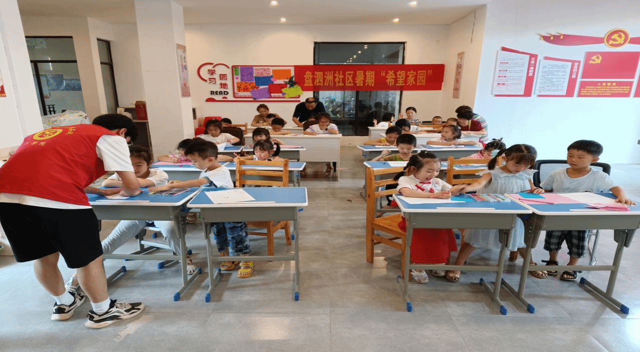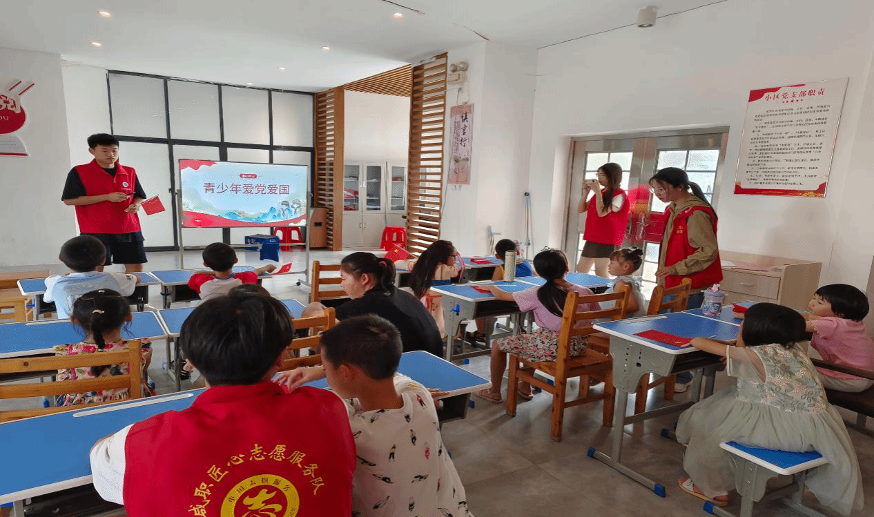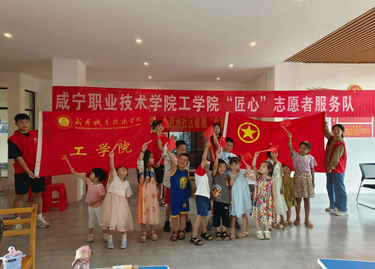 7月17日,为深入学习宣传贯彻习近平新时代中国特色社会主义思想和党的二十大精神,落实“强国复兴有我”主题宣传教育活动,DB真人旗舰“匠心”志愿服务队志愿者们在咸宁市盘泗洲社区为“希望家园”孩子们带来了一堂别开生面的爱国主题教育启蒙课。