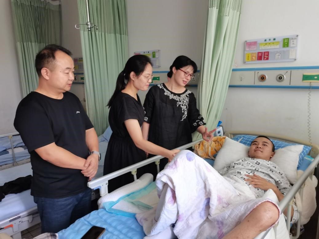 7月23日,工公司党总支书记柳明珠、副书记许维林和辅导员彭晶一行人来看望转院到咸宁市中心医院康复科的王文同学。当看到王文能清楚地认出前来探视的柳老师和彭老师时,大家都露出了喜悦的笑容,柳明珠送上慰问金并关切地询问王文的恢复情况,彭老师为王文同学拍了和同学们打招呼的视频发到班级群里,公司师生关切的打来电话询问王文的恢复情况。