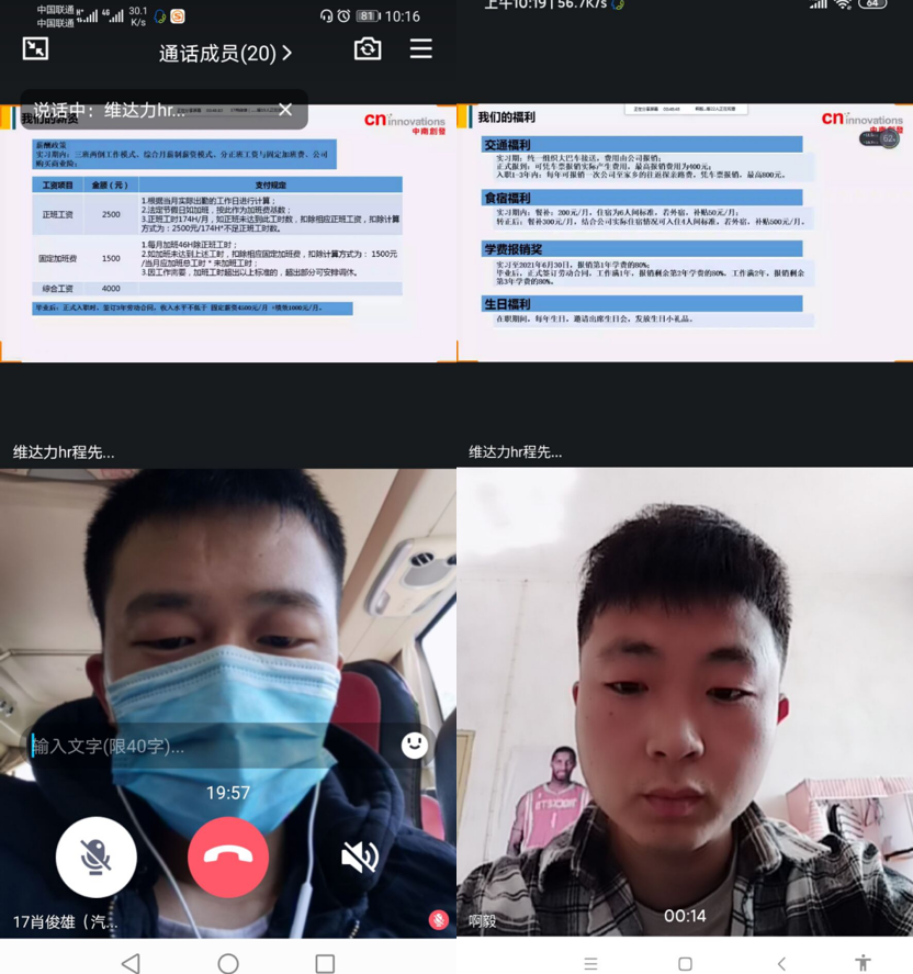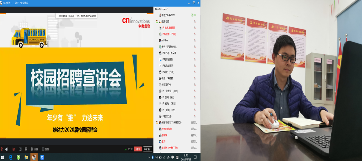 本次活动,赤壁维达力实业有限公司通过qq视频会议、以“年少有‘维’力达未来”为主题,用PPT展示方式,对公司的历史、发展概况,企业现状,职业发展方向,薪资待遇等情况进行了详细的介绍。随后还组织了问答环节,应聘同学们和面试官在qq上进行了互动交流。最终,有16名同学与赤壁维达力实业有限公司达成初步就业意向。