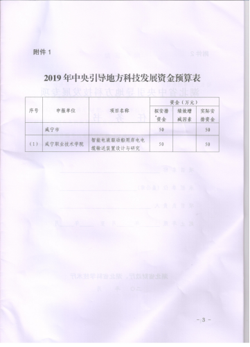 湖北省财政厅、科技厅联合开展的2019年中央引导地方科技发展专项资金申报工作中,公司徐文娟老师团队申报的科技创新示范项目“智能电液驱动船用岸电电缆输送装置设计与研究”获批准立项,并获国家资助资金50万元。全省77个立项资助项目中,该项目是唯一一个高职院校入选项目,也是公司第一个科技工作获得中央财政支持的项目。